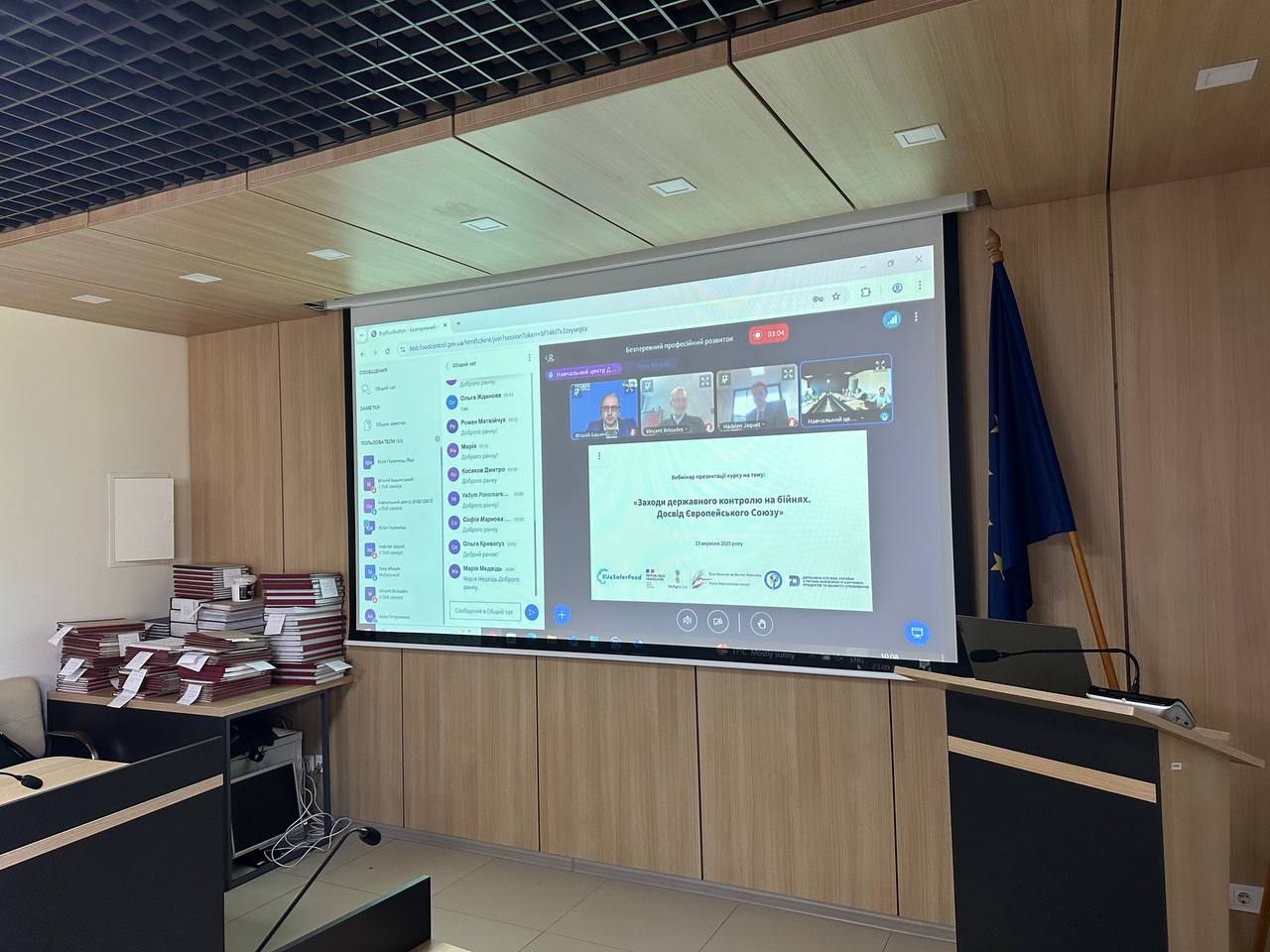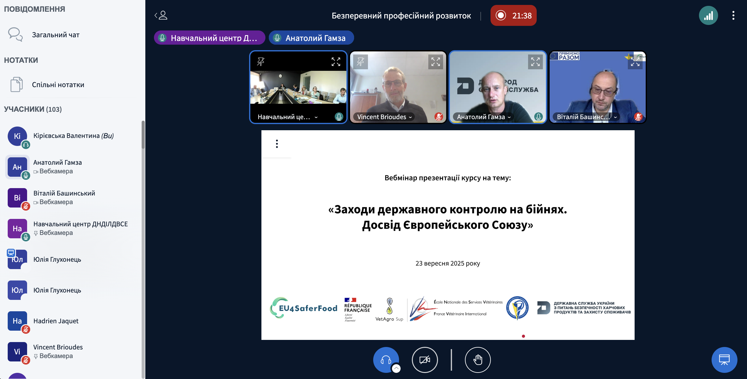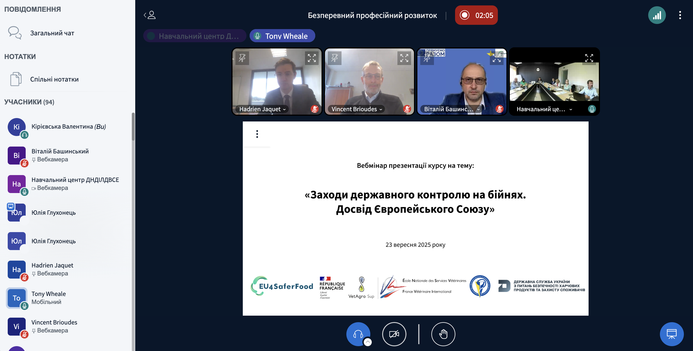 23 вересня 2025 року у ДНДІЛДВСЕ відбувся вебінар-презентація нового дистанційного курсу «Заходи державного контролю на бійнях. Досвід Європейського Союзу», розробленого ДНДІЛДВСЕ спільно з проєктом EU4SaferFood, Міністерством аграрної політики Франції, Ліонською ветеринарною школою (ENSV-FVI) та Держпродспоживслужбою.